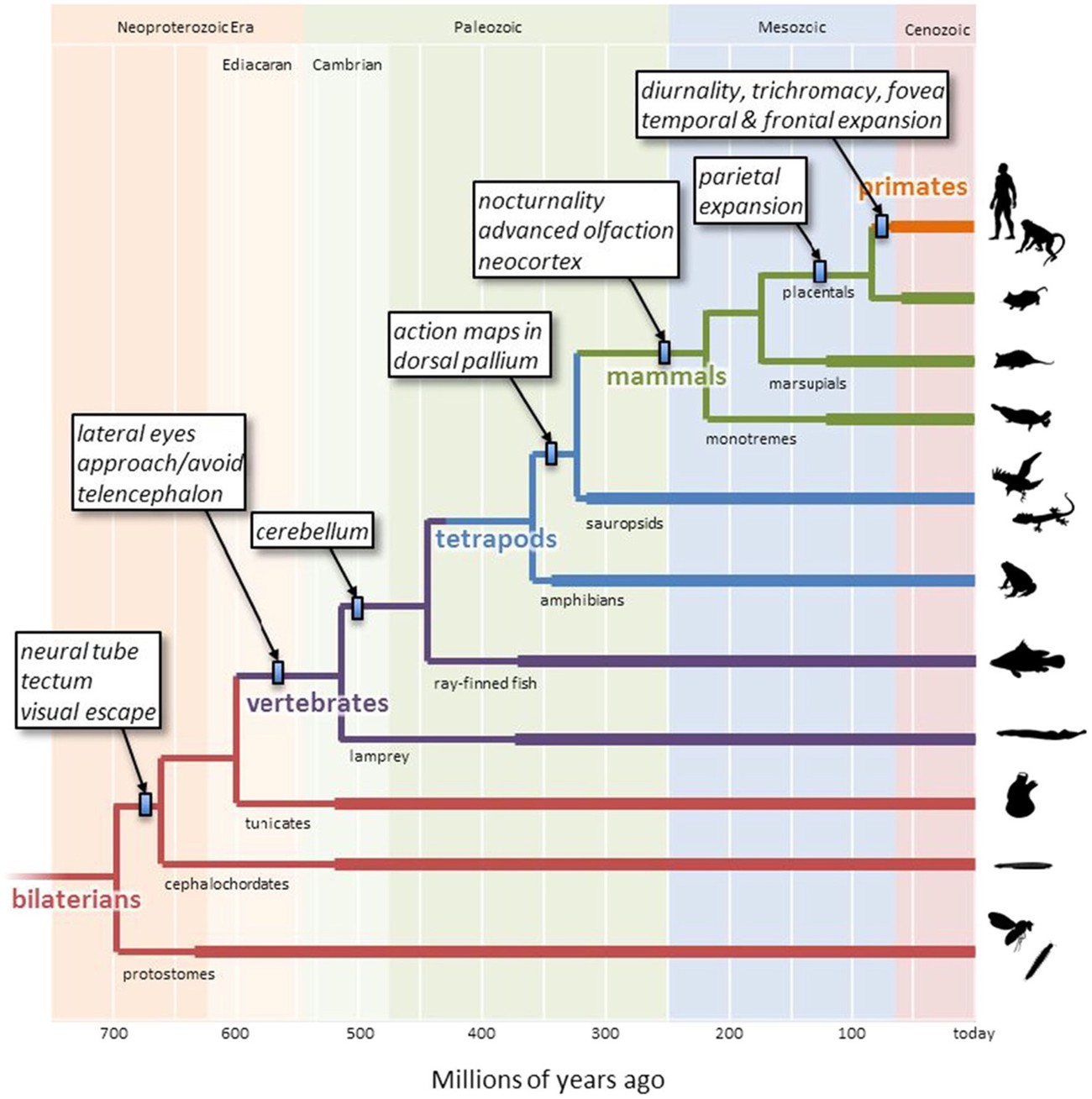 Primat soy hattındaki mekânsal etkileşim, uzun ve karmaşık bir evrimsel süreçle şekillenmiştir (Şekil 1). Yaklaşık 500 milyon yıl önce Kambriyen döneminde (Cambrian epoch) görsel rehberli yönelim davranışlarının ortaya çıkması önemli bir adım olmuştur. İlkel kordalı atalarımız, tek bir fotosensitif yama (photosensitive patch) aracılığıyla orta beyne (tektum) projeksiyon yapan ve omuriliğe bağlanarak kaçış tepkilerini tetikleyen basit bir görsel kaçış devresine sahipti (Lacalli, 1996, 2018). Omurgalı soy hattında, fotosensitif yama başın iki yanına, iki farklı göz yaması olacak şekilde ayrıldı (Butler, 2000). Göz yamaları, karşı taraftaki tektuma projeksiyon yapıyor ve tektum ise aynı taraf omuriliğine bağlantı sağlıyordu. Bu sinirsel devre, atalarımızın yaklaşan avcılardan uzaklaşmasını sağlayan reflekse dayalı kaçış hareketlerini mümkün kıldı (Şekil 2a). Göz yamaları genişledikçe, kubbe şeklini alarak lensi oluşturdu ve böylece dış uyaranların topografik haritalamasını sağlayan iki boyutlu bir retina ortaya çıktı (Lamb, 2013). Tektum da paralel olarak genişledi; yüzeysel katmanlarında üç boyutlu topografik bir harita oluşurken, derin katmanlarda ise projeksiyon gradyanları (gradients of downstream projections) oluşturdu. Sonuç olarak, belirli konumlardaki tehdit uyaranlarına karşı yönelimli kaçış tepkilerini temsil eden bir “eylem haritası” (action map) oluştu.