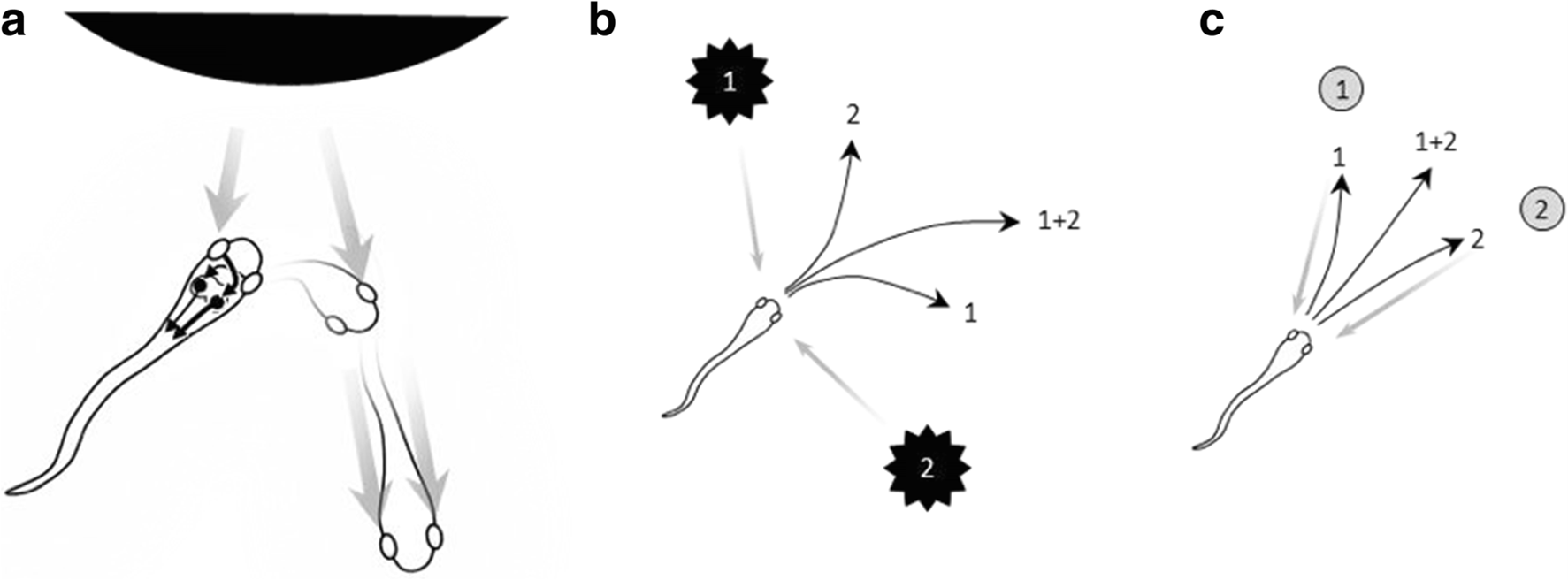 (b) İki tehdit edici uyarandan (siyah yıldızlar) uzaklaşma yönlerinin (numaralı oklar) mekânsal ortalaması, etkili bir kaçış tepkisi üretir.