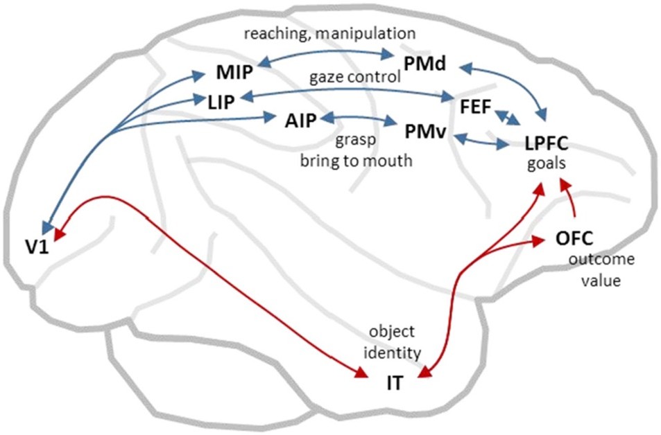 Şekil 3. Primat beyin korteksi, dorsomedial bölgelerde (mavi oklar) birbirine paralel bir dizi sensörimotor akış içerir. Bu bölgelerin her biri, uzamsal temsil biçimlerine dayalı olarak, belirli bir eylem türüne aracılık eder. Ayrıca ventrolateral bölgelerde (kırmızı oklar) hesaplanan nesne kimliği ve sonuç değeri bilgilerini kullanarak mevcut davranışsal bağlamda en uygun eylemleri seçer. Kısaltmalar: AIP (anterior intraparietal alan), FEF (frontal göz alanları), IT (inferotemporal korteks), LIP (lateral intraparietal alan), LPFC (lateral prefrontal korteks), MIP (medial intraparietal alan), OFC (orbitofrontal korteks), PMd (dorsal premotor korteks), PMv (ventral premotor korteks), V1 (birincil görsel korteks).